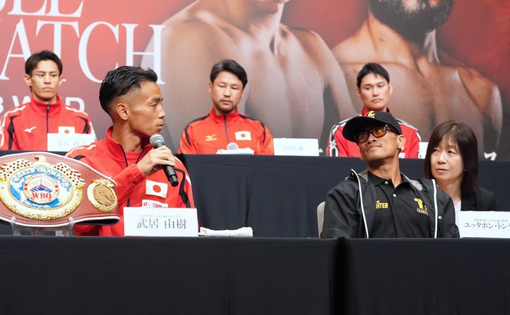 WBO世界バンタム級王者・武居由樹(28=大橋)が2度目の防衛戦(28日、横浜BUNTAI)に向け、26日に横浜市内のホテルで公式会見に臨みました。対戦する、挑戦者の同級7位ユッタポン・トンデイ(31=タイ)と初対面。「いい試合を見せるつもりはない。自分が一方的に殴る試合を見せたい」と王座防衛を誓いました。